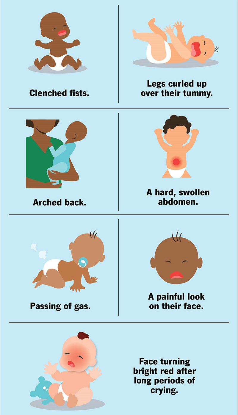 به طور معمول همه نوزادان در 3 ماهه اول زندگی بیشتر از زمان‌های دیگر گریه می‌کنند. تعریف دقیق و مشخصی از "گریه بیش از حد" وجود ندارد. هر چند بسیاری از منابع معتقدند که تا 2 ساعت گریه در طول یک روز می‌تواند طبیعی باشد. نوزادان غیرکولیکی کمتر گریه می‌کنند و مدت زمان گریه آن‌ها کوتاه‌تر است. نکته جالب در خصوص گریه‌های کولیکی این است که این گریه‌ها معمولا عصر یا شب شروع می‌شوند. پیش از شروع این گریه نوزاد ممکن است در شرایط مختلفی قرار داشته باشد: در حال خندیدن باشد، در حال شیر خوردن باشد، خوابیده باشد یا در حال بهانه‌گیری باشد. به همین علت گفته می‌شود که گریه‌های کولیک معمولا علت مشخصی ندارند. علاوه بر گریه‌های شدید و جیغ‌مانند، کولیک ممکن است علائم دیگری هم داشته باشد که عبارتند از:
