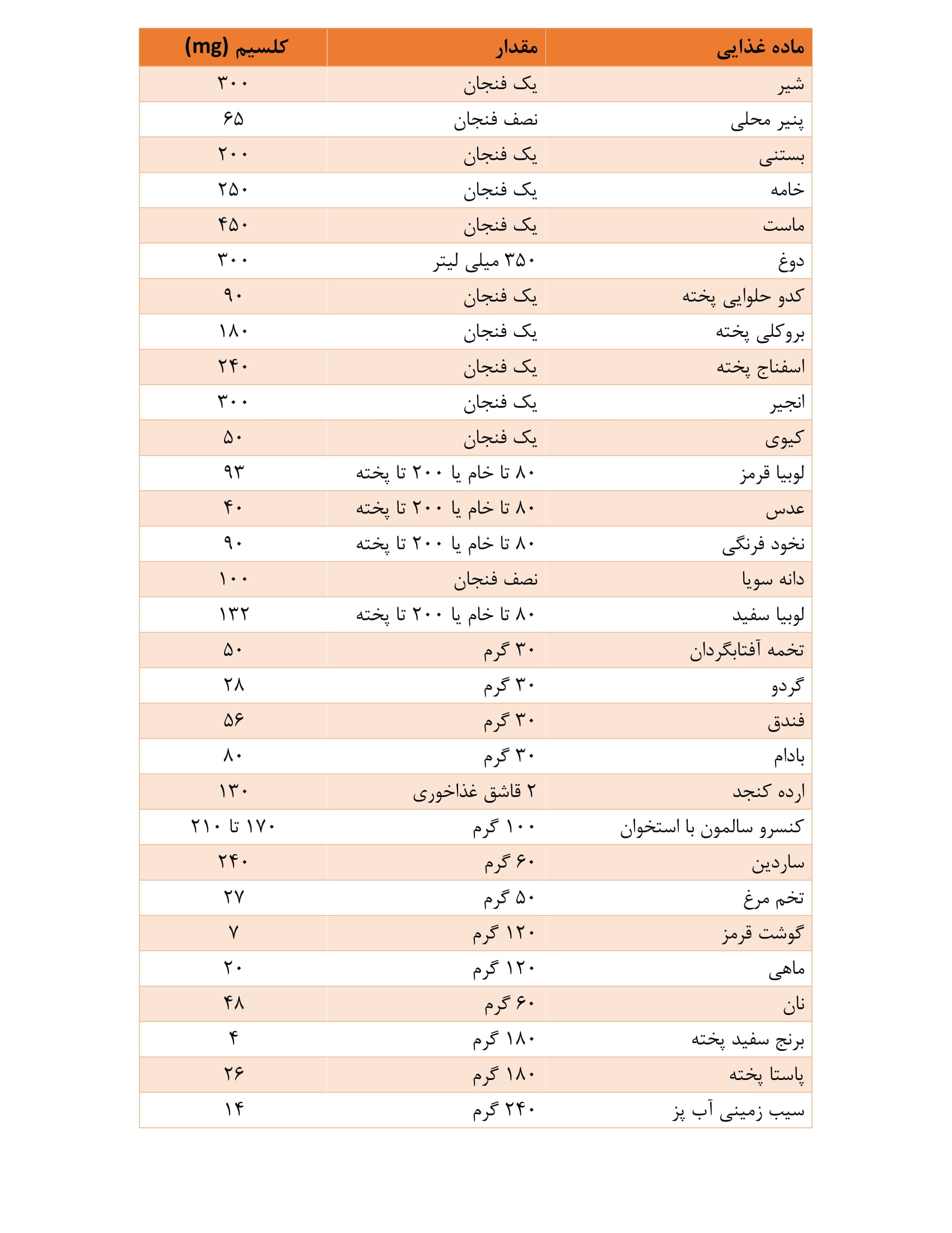 مقدار کلسیم در منابع غذایی (روز جهانی پیشگیری از پوکی استخوان)