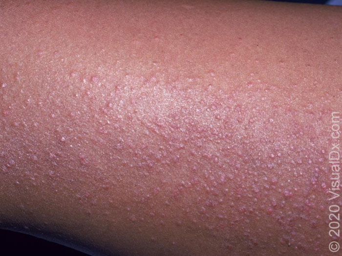 - متورم شدن فولیکولهای مو که بیشتر در ناحیه صورت، بازو و ران رخ میدهد. (مانند آنچه در تصویر مشاهده میکنید.)